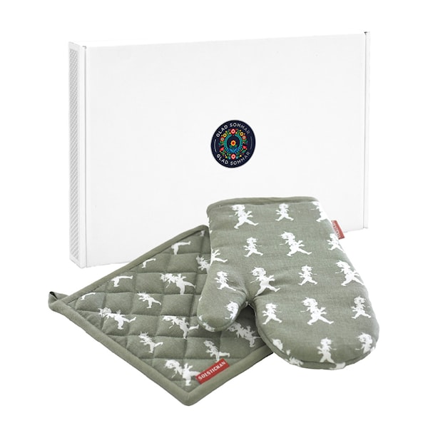 Solstickans gåvoset med grytlapp och grytvante i en elegant presentask är ett stilfullt tillskott till köket. Båda delarna är tillverkade i 100% bomull och pryds av det ikoniska Solstickan-mönstret, vilket ger en klassisk och tidlös känsla.