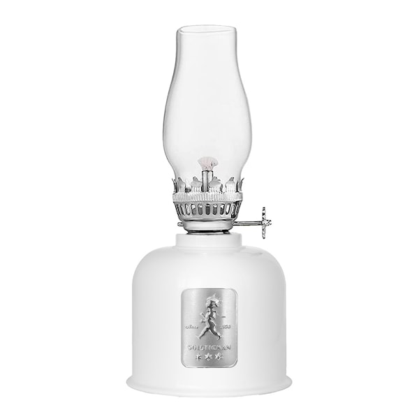 Elegant och praktisk fotogenlampa i tidlös design med ett silveremblem av den klassiska Solstickepojken.