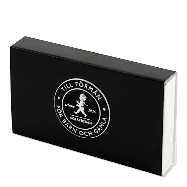 Tändsticksask med stilfullt emblem på framsidan och repeterande mönster på baksidan, med avbildning av den klassiska Solstickanpojken skapad av Einar Nerman 1936. Tillverkad i Tidaholm, Sverige. Innehåller ca 30 tändstickor.