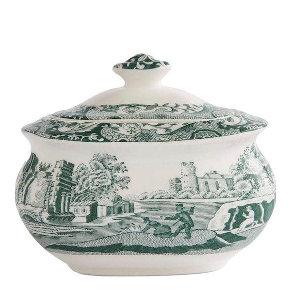 Spode Heritage Green Italian sockerskål med lock 0,25 L förenar tidlös design med praktisk funktion. Den djupgröna nyansen ger en modern tolkning av det klassiska Blue Italian-mönstret och gör den till ett dekorativt inslag på bordet.