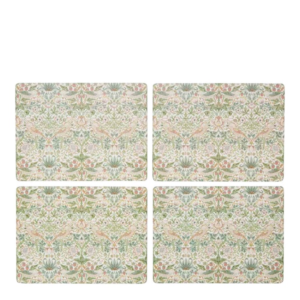 Ge dukningen en konstnärlig twist med Morris & Co Strawberry Thief-bordstabletter i fyrpack från Spode. William Morris klassiska motiv (1833) porträtterar fåglar som stjäl jordgubbar, omhuldade av rosa och gröna blad.