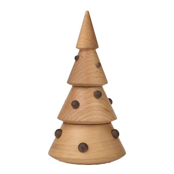 Julgranen från Spring Copenhagen fångar julens själ i en enkel men uttrycksfull träform. Thor Höys design är lågmäld men kraftfull – inspirerad av dansk hygge och skapad för att komplettera snarare än konkurrera med annan julinredning. Den 15,8 cm höga granen är gjord i FSC-certifierad bok och ask, med en mjuk yta och behaglig vikt.