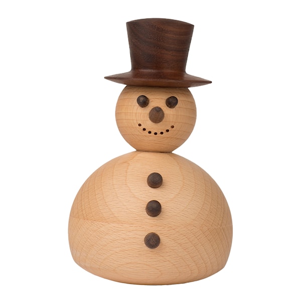 Snögubben från Spring Copenhagen är en dekorativ figur som fångar vinterkänslan med både charm och nostalgi. Hans uttrycksfulla ögon, runda knappar, höga hatt och morotsnäsa väcker minnen av barndomens snölekar – att bygga snögubbar som aldrig riktigt blev symmetriska men alltid lika älskade. Designen är signerad Thor Høy, och materialet är FSC-certifierad bok, ask och valnöt.