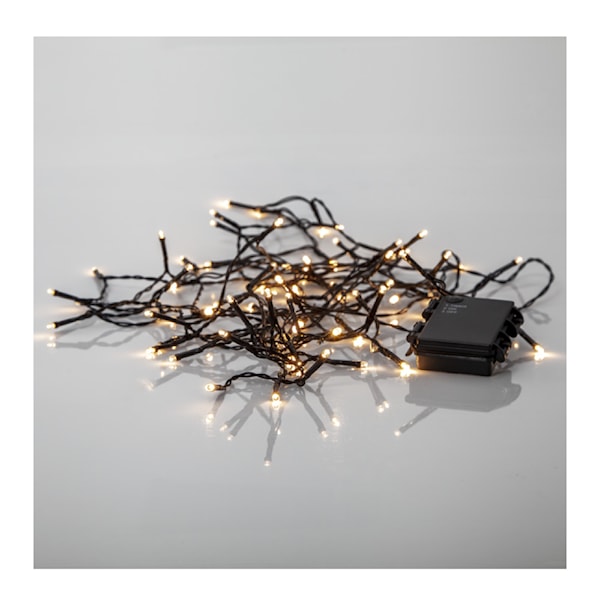 Akku ljusslinga 80 ljus. Uppgradera din ute- eller innemiljö med den batteridrivna ljusslingan från Star Trading! Med 80 varmvita ljuspunkter skapar den ett stämningsfullt sken, oavsett om du placerar den inomhus eller utomhus. Slingan drivs av 3xAA-batterier och har en smart timerfunktion som automatiskt aktiverar den i 6 timmar och släcker den i 18 timmar – perfekt för att förlänga batteritiden och skapa en mysig belysning utan ansträngning. Enkel att installera i trädgården eller på balkongen för att skapa en magisk atmosfär.