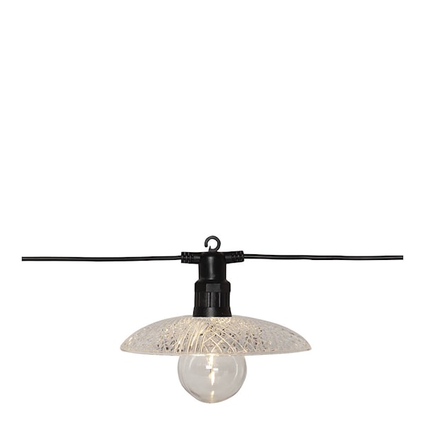 Glassy Light 473-10 från Star Trading är en exklusiv ljusslinga för utomhusbruk som kombinerar modern design med klassisk glaskänsla. Den 350 cm långa slingan består av 6 lampor med transparenta skärmar som liknar pressat glas. Ljuset bryts vackert genom ytan och ger en mjuk, skimrande effekt.