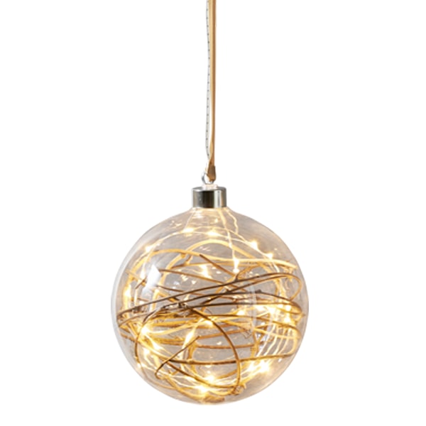 - Body: Glass, Transparent (Ø 15 cm glass ball); Cable: Metal, Silver (dew drop crab wire inside glass ball); Cable: Plastic, PVC 3, Transparent ; Cap: Metal, Silver ; Accessories: Fabric, Polyester, Brown (160cm ribbon); Ornament: Wood, Brown (rattan branc