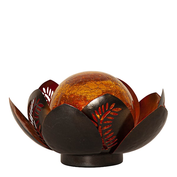 Lilly 482-80 från Star Trading är en dekorativ solcellsbelysning som förvandlar uteplatsen till en stämningsfull oas. De kopparfärgade metallbladen bildar en elegant ram runt den bärnstensfärgade glaskulan, som på kvällen lyser upp med ett varmt gyllene sken.