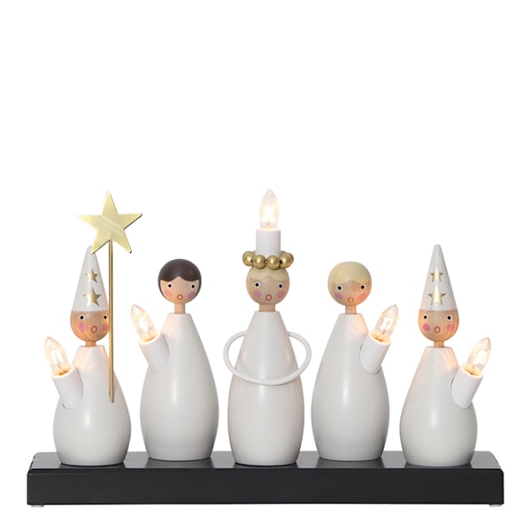 Låt ett litet luciatåg lysa upp hemmet med denna fina adventsljustake från Star Trading. Ljusstaken har fem ljuskällor och är gjord av trä, med en dekorativ guldstjärna i metall som en av stjärngossarna håller. Den perfekta adventsljustaken för en härlig julstämning! Ljusstaken har vit sladd med en längd på 180 cm, samt strömbrytare. Ljuskällor ingår.