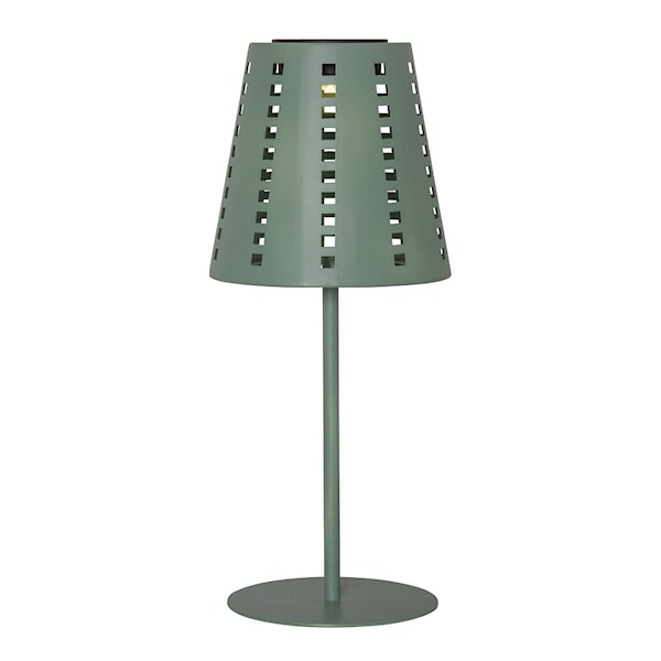 Sola 482-73 från Star Trading är en solcellsdriven bordslampa i grön metall som kombinerar dekorativ design med enkel funktion. Lampan har en skärm med rutmönster som skapar fina ljuseffekter i mörkret och ger en varm och välkomnande känsla på uteplatsen.