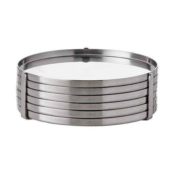 Glasunderlägg 6-pack i stål från Stelton, designade av Arne Jacobsen, ger bordet ett sofistikerat uttryck med sin cylindriska form. Setet består av sex underlägg och ett enkelt stativ som håller dem samlade när de inte används. Dessa glasunderlägg är perfekta för att skydda bordet från fläckar och ringar, och deras minimalistiska design lyfter fram drycken på ett subtilt och elegant sätt. Ett tidlöst tillbehör för den designmedvetna.
