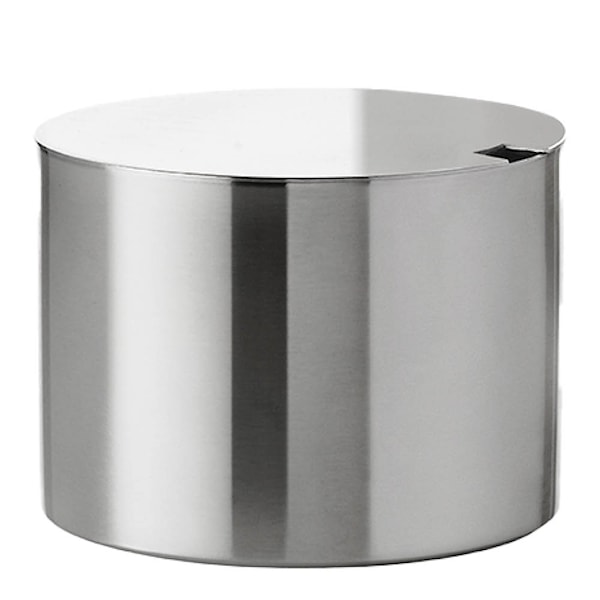 Arne Jacobsen sukkerskål i rostfritt stål från Steltons ikoniska Cylinda-serie. Denna eleganta sukkerskål på 20 cl har en cylindrisk form som ger ett rent och tidlöst uttryck. Locket skyddar innehållet och har en praktisk öppning som gör det enkelt att placera socker- eller serveringsskeden utan att ta bort locket. Förutom att användas för socker kan skålen även fungera för servering av småsnacks eller tillbehör och tillför en sofistikerad touch till dukningen.