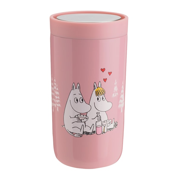 Mumin To Go Click termomugg 20 cl moomin love från Stelton bjuder på ett charmigt motiv hämtat från serien "Mumin och kometen", där Mumintrollet och Snorkfröken sitter tillsammans och njuter av Muminmammans flädersaft. Denna mugg kombinerar elegant design med hög funktionalitet för dig som vill ha något praktiskt och stilrent på språng. Med ett enkelt klick på locket kan du dricka från alla håll och lika enkelt stänga för att hålla din dryck varm eller kall längre. Perfekt för pendling, resor och när du vill ha en varm kopp nära till hands var du än är.