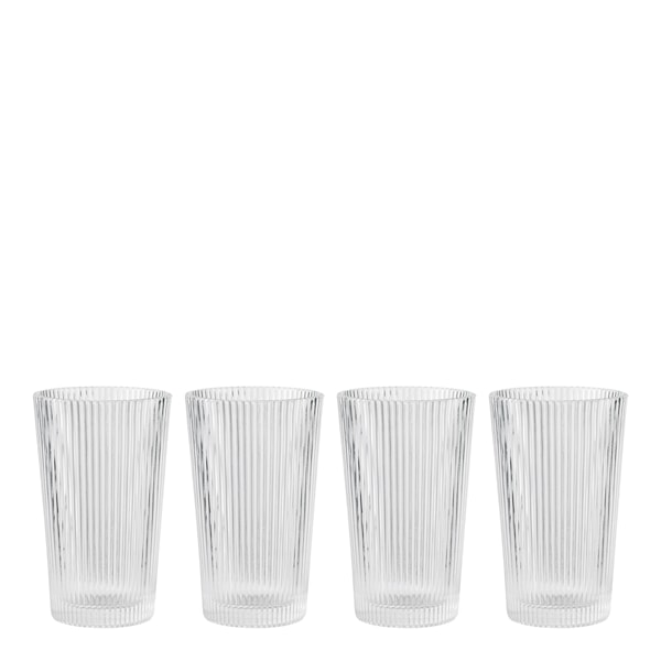 Den räfflade formen är både diskret och elegant vilket gör dom utmärkta som drinkglas men du kan självklart använda dom som stora vattenglas, glas till iskaffe eller till hett kaffe och te. Glasen är robusta i sin design och kan diskas i diskmaskin, vilket gör dem perfekta för både vardag och fest.