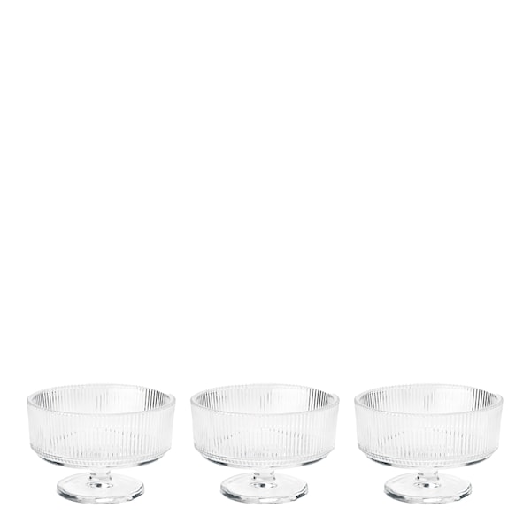 Pilastro skål på fot 11 cm från Stelton, i 3-pack, kombinerar skulptural elegans med funktion. Det räfflade klara glaset och inspirationen från 20-talets Art Deco gör dem till ett stilfullt inslag på bordet.