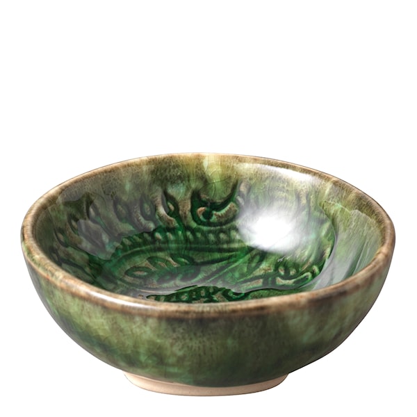 Skålens karakteristiska reliefmönster och levande glasyr skapar ett hantverksmässigt uttryck där varje exemplar blir unikt. Formen gör den lika användbar till vardagens middagar som till festliga tillfällen där detaljerna får ta plats i dukningen.