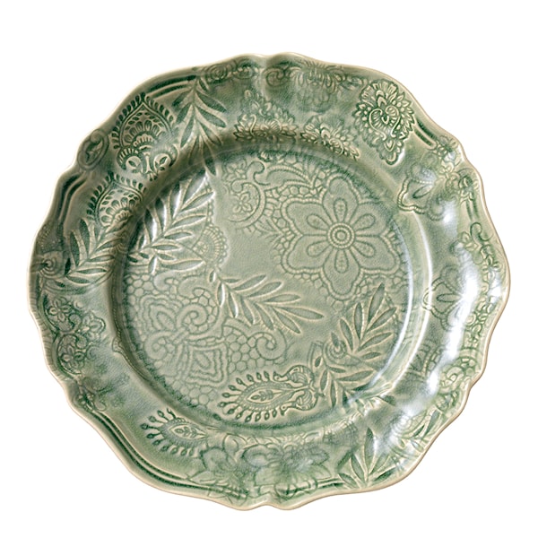 Duka fram ett uppläggningsfat i en glasyr som hämtat inspiration från växtriket. Detta stora runda fat får bordet att slå ut i blom. En härlig glasyr som ger vackra färgskiftningar och får maten att se riktigt läcker ut.