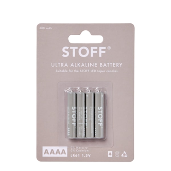Batterier 1,5V, 580mAh i 4-pack från Stoff/Uyuni. Passar utmärkt till LED-ljusen från samma varumärke. Räcker till 150+ timmar med 2 st. AAAA-batterier per LED ljus.
