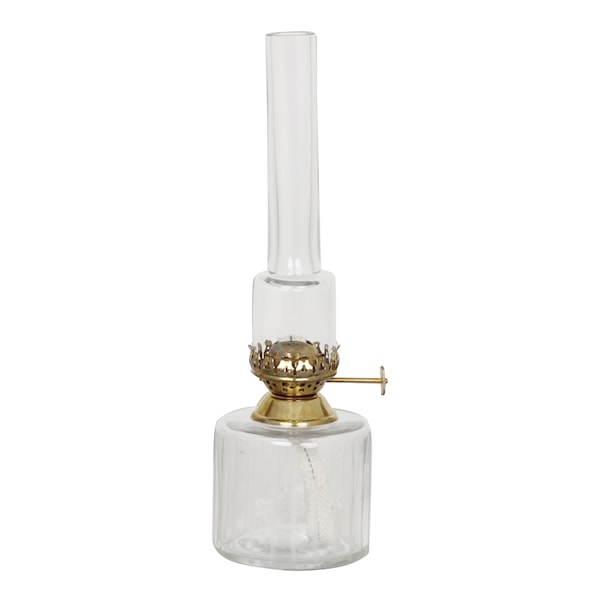 Här en vacker fotogenlampa i glas, modell mindre, med brännrör i klarglas och brännare i nickel.