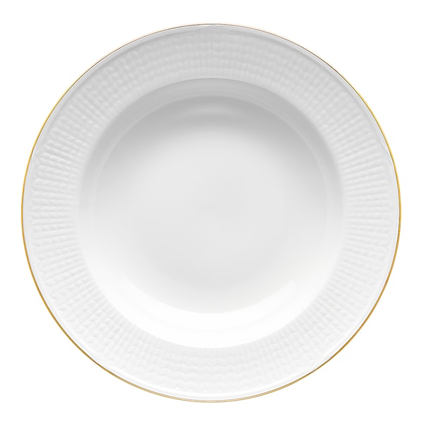 Tallriken är gjord av slitstarkt fältspatporslin och prydd med en äkta förgylld, inglaserad guldkant som tål daglig användning. Med en diameter på 25 cm och sin djupa form är den perfekt för soppor, grytor och generösa frukostportioner med fil och flingor. Dessutom fungerar den även utmärkt som pastatallrik eller för en härlig caesarsallad. Dess klassiska bräm och tidlösa uttryck gör den enkel att matcha med både Gala-serien och den traditionella servisen.