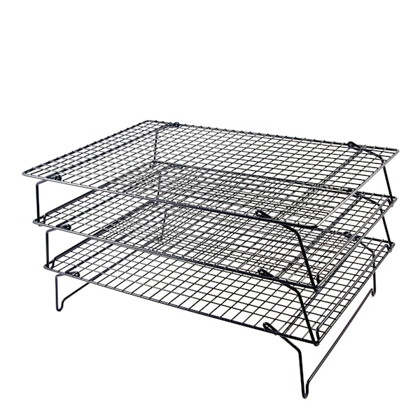 Avkylningsgaller 40x25 cm 3-pack från Tala är ett platsbesparande 3-våningar Non-Stick avsvalningsgaller, idealiskt för att hålla kakor, muffins mm upp från bänkskivan medan de svalnar. Avsvalningsgallret gör att ångan försvinner från alla ytor och kyler kakor snabbare.