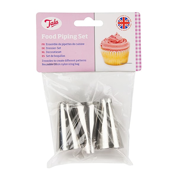 Talas spritset med stora tyllar är extra starkt och återanvändbart, vilket gör det idealiskt för att spritsa olika typer av mat. Detta dekoreringsset innehåller tre munstycken som är perfekta för smörkräm, frosting, färskost, vispad grädde och potatismos. De inkluderade tyllarna är: 3 Stor tjock slät, 6 Stor fin stjärna och 7 Stor stjärna. Med detta set kan du enkelt skapa vackra och professionella dekorationer på dina bakverk och maträtter. Ett oumbärligt verktyg för alla som älskar att dekorera och experimentera i köket.