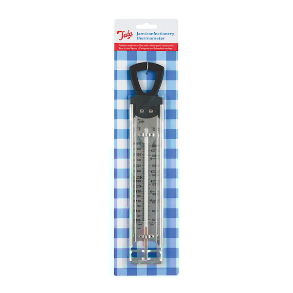 Talas sylttermometer, med en längd på 15,4 cm, är ett pålitligt verktyg för både syltkokning och fritering. Den vattentäta konstruktionen säkerställer hållbarhet och enkel rengöring. Med lättlästa siffror och avläsningar i både Celsius och Fahrenheit, kan temperaturen mätas upp till 220°C. Denna termometer gör det enkelt att övervaka temperaturen noggrant och säkerställer perfekta resultat varje gång. Ett oumbärligt redskap för alla som vill ha precision i köket.