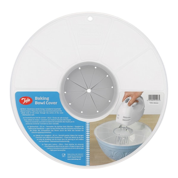 Tala vispskydd är en praktisk lösning för att undvika spill när du vispar smet, grädde eller deg. Detta plastlock sitter tätt över en bunke med en diameter på upp till 30 cm och förhindrar stänk under mixning.