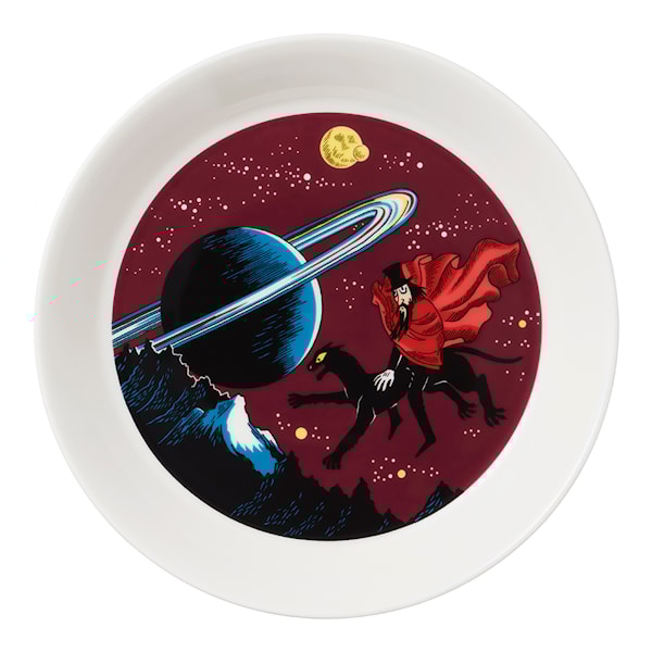 Ännu en vacker sago-illustration av designern Tove Slotte-Elevant som är framtagen från original teckningar. Motivet på denna tallrik gestaltar ”Trollkarlen” som rider på sin svarta panter över himlen, på jakt efter juveler. Han bor i ett litet hus vid världens ände som saknar både dörrar och fönster. Trollkarlen letar efter en särskild rubin vid namn Kungsrubinen som han ännu inte hittat. Kombinera gärna skålen med muggen i samma motiv.