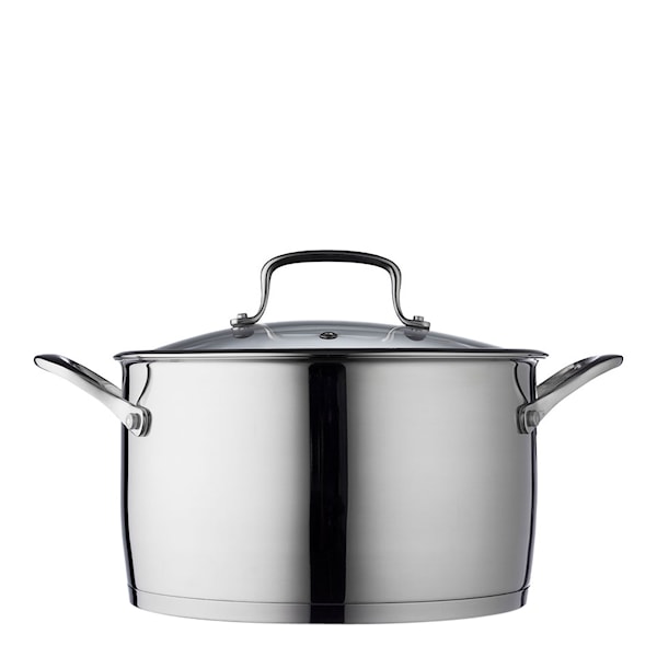 Grytan tål alla typer av köksredskap, har tillhörande glaslock och rymmer 6,2 liter.