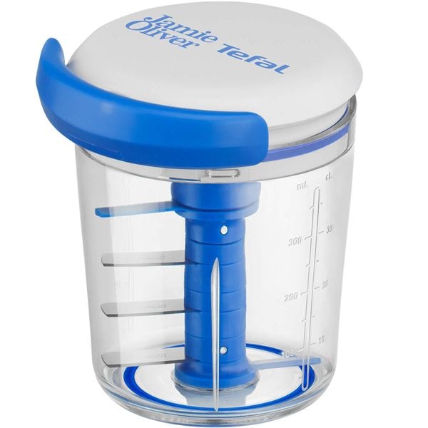 Jamie Oliver Chop & Shaker är ett smart och mångsidigt redskap som förenklar matlagningen och ger dig möjlighet att snabbt hacka och blanda ingredienser till allt från salsa och pesto till marinader och dressingar. Med en kapacitet på 450 ml, ett robust dragsystem och sylvassa knivblad i rostfritt stål klarar den även hårda ingredienser som nötter och morötter. Ju fler drag du gör med handtaget, desto finare hackas innehållet – och när det är dags att blanda i flytande ingredienser är det bara att skaka hela behållaren.
