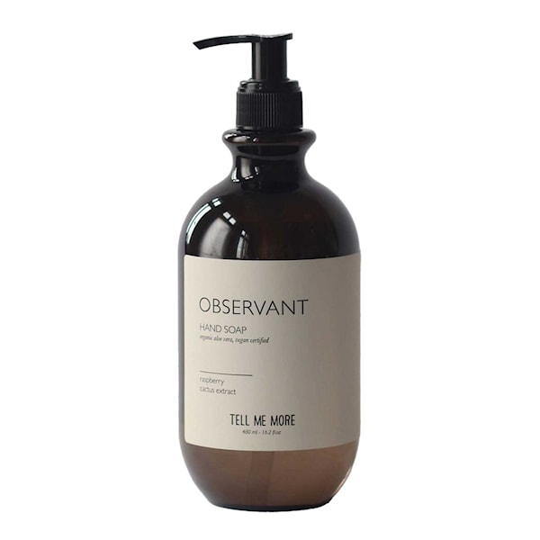 Handtvål 480 ml Observant från Tell Me More har en subtil doft av hallon och kaktus, kombinerat med delikata toner av skogsväxter och blommor, vilket ger en unik doftupplevelse.