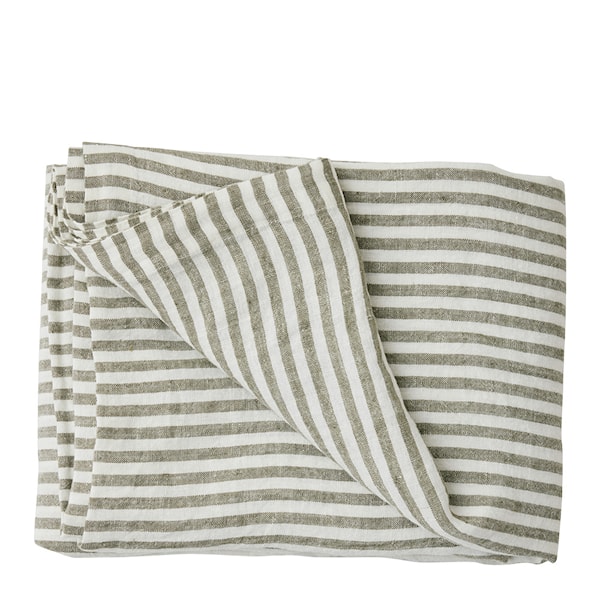 Leon kvadratisk linneduk 175x175 cm från Tell Me More är tillverkad i 100 % europeiskt linne och handvävd för att ge tyget en grov och naturlig textur. Duken har ett klassiskt randigt mönster och en dekorativ kant som elegant ramar in bordet på ett enkelt och stilfullt sätt.
