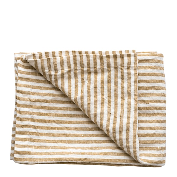 Leon kvadratisk linneduk på 175x175 cm från Tell Me More är tillverkad av 100% europeiskt linne och handvävd för att ge tyget en grov och naturlig struktur. Den har ett klassiskt randigt mönster och en dekorativ kant som ramar in bordet på ett enkelt och stilrent sätt.