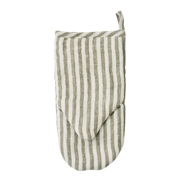 Leon ugnsvante 30x16 cm i färgen Seagrass är tillverkad i handvävt linne med bomullsfoder. De klassiska ränderna och den robusta linstrukturen ger ett tidlöst och funktionellt inslag i köket. Varje garn är handfärgat och soltorkat, vilket ger tyget levande och varierande nyanser.
