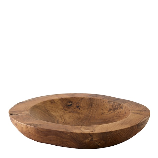 Teakskålen från Tell Me More är en stor serveringsskål med en diameter på 40 cm, tillverkad av teakrötter – ett restmaterial från träindustrin. Varje skål har sitt eget unika uttryck, med särpräglade ådringar och mönster som gör att form och utseende varierar från exemplar till exemplar.