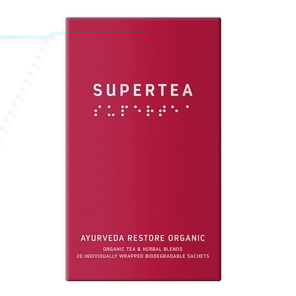 Teministeriet Supertea ekologiskt te 30 g Ayurveda Restore är ett fylligt örtte med varm och kryddig karaktär. Tillverkat av ekologiska ingredienser som ingefära, kanel och kardemumma, ger teet en mjuk och harmonisk smak.