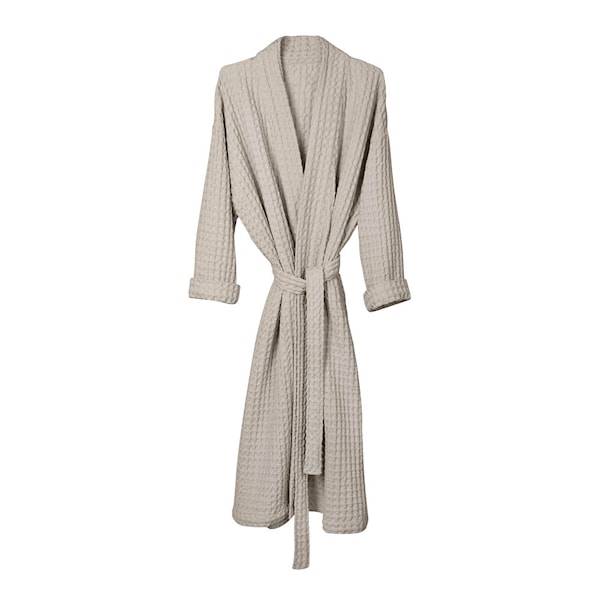 Big Waffle badrock från The Organic Company är vävd i en mjuk och taktil våffelstruktur som omsluter kroppen med lätthet och värme. Den generösa unisex-passformen ger en avslappnad silhuett, medan de dubbla bälteshällorna låter bältet vila där det känns naturligt.
