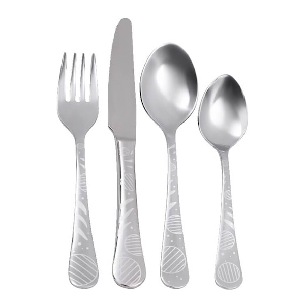 • Innehåller kniv, gaffel, matsked och tesked