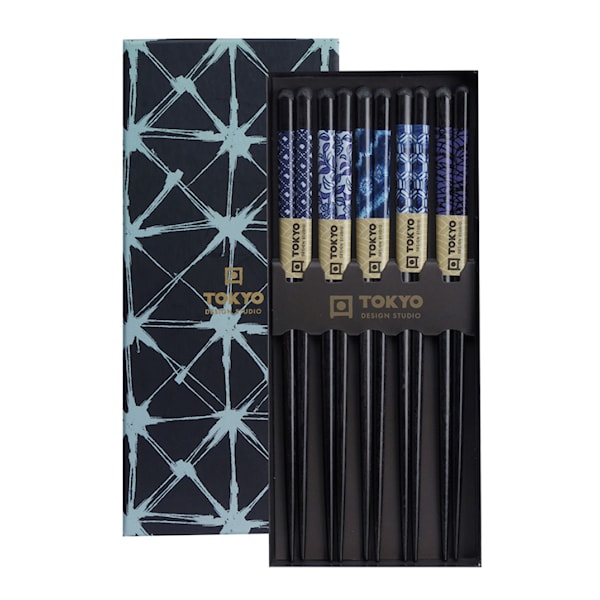 Setet innehåller fem par ätpinnar med koordinerade mönster, levererade i en snygg presentask. Tillverkade i slitstarkt material och formade för att ligga bekvämt i handen – perfekta till allt från sushi till smårätter.