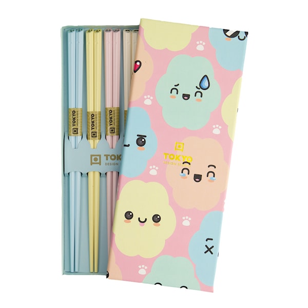 Setet innehåller fem par ätpinnar med koordinerade mönster, levererade i en snygg presentask. Tillverkade i slitstarkt material och formade för att ligga bekvämt i handen – perfekta till allt från sushi till smårätter.