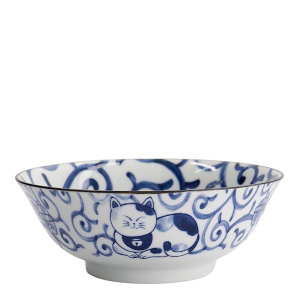 Tokyo Design Studio Kawaii ramenskål 20 cm Katt Neko 33418 är en rymlig keramisk skål med japansk känsla och ett charmigt kattmotiv i blått. Perfekt för ramen, nudlar, buljonger eller andra varma rätter som kräver generöst utrymme.