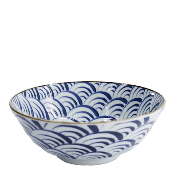 Den blåvita färgpaletten och det våginspirerade mönstret ger skålen ett distinkt uttryck som harmonierar med japansk designtradition. Porslinet är tåligt nog för daglig användning men elegant nog att ta plats vid en finare dukning.