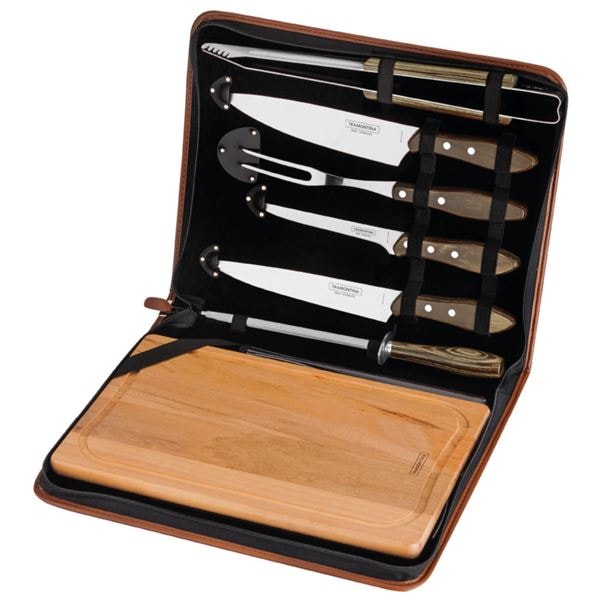 Detta exklusiva grillset från Tramontina innehåller allt du behöver för att ta din grillning till nästa nivå. Setet består av sju genomtänkta delar: skärbräda, grillpincett, grillgaffel, filékniv, kockkniv, köttkniv och slipstål – allt förpackat i ett stilrent etui som gör det enkelt att förvara och ta med.
