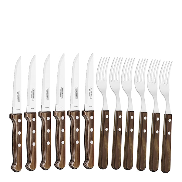 Setet består av 6 knivar (23,5 cm) och 6 gafflar (21 cm) i rostfritt stål av hög kvalitet. Handtagen är gjorda i furu med Tramontinas unika polywood-teknik, där träet pressas hårt och ytbehandlas för att bli extra slitstarkt och tåligt över tid. Knivarna har en vass egg som enkelt skär igenom kött och grillade råvaror, medan gafflarna är stabila och bekväma att använda.