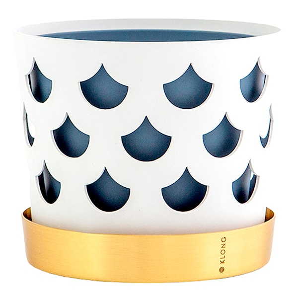 Liten kruka av mässing och stål, formgiven av Ania Pauser för Klong. Krukan består av tre delar: innerkruka, ytterkruka och fat. Krukorna finns i flera mönster, i tre storlekar och i två kulörer. Innerkrukan är matt blå och fatet av mässing.