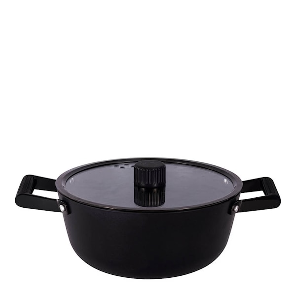Kan användas på alla hällar, inklusive induktion, och tål både ugn och metallredskap. HALO-handtagen i sömlöst stål är värmetåliga och ergonomiska. Den helsvarta färgen ger ett stilrent helhetsintryck.