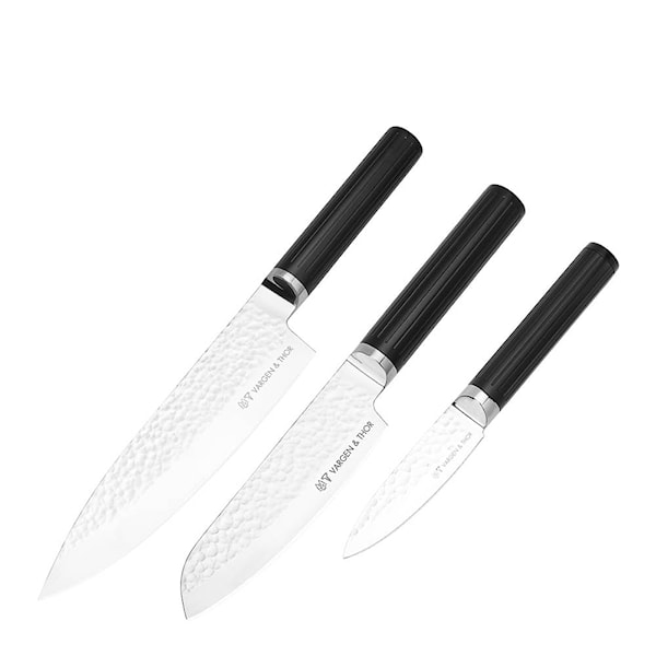 Glima knivset i stål, 3 delar, svart från Vargen & Thor är ett komplett set för dig som vill ha stil, styrka och skärpa i varje moment. Knivbladen är gjorda av svenskt stål och har en distinkt hamrad finish som både ser exklusiv ut och ger karaktär.