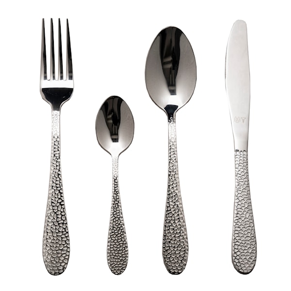 Setet består av gafflar, knivar, matskedar och teskedar – allt du behöver för att skapa en harmonisk och komplett bordsdukning. Det slitatarka stålet är tåligt nog för vardagsanvändning och kan diskas i maskin upp till 45°C, vilket gör underhållet enkelt utan att tumma på kvaliteten.