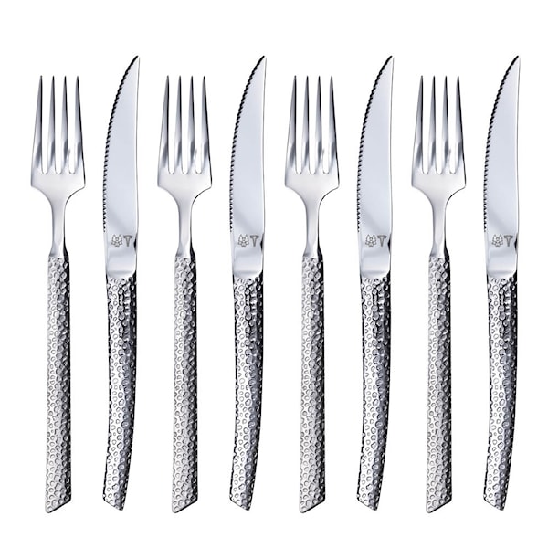 Lava bestickset 8 delar från Vargen & Thor kombinerar tålighet med sofistikerad design. Detta steakset består av 4 knivar och 4 gafflar i rostfritt stål, där de vackert hamrade handtagen ger en unik karaktär, ett skönt grepp och en elegant silverfinish.