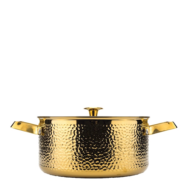 Brassa Meya-gryta med matchande lock från Vargen & Thor är en 4-liters gryta i mässing som kombinerar funktionalitet med elegant design. Med sin vackra, hamrade yta och insida av rostfritt, borstat stål utan beläggning är MEYA både ett stilfullt och praktiskt tillskott till ditt kök.